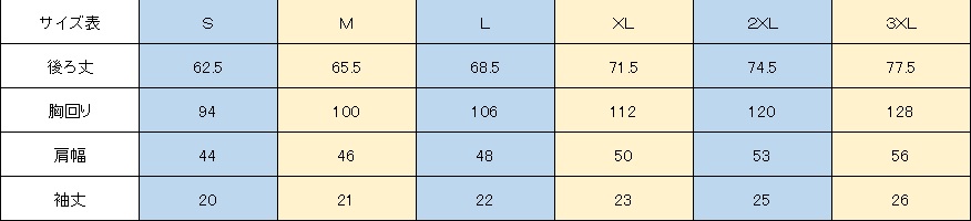 サイズ表 | S | M | L | XL | 2XL | 3XL |